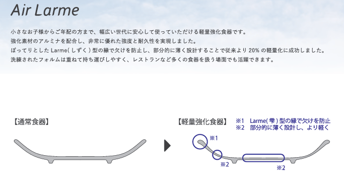 【Air Larme】 小さなお子様からご年配の方まで、幅広い世代に安心して使っていただける軽量強化食器です。強化素材のアルミナを配合し、非常に優れた強度と耐久性を実現しました。