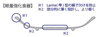 ぽってりとしたLarme(しずく)型の縁で欠けを防止し、部分的に薄く設計する事で従来より20%の軽量化に成功しました。