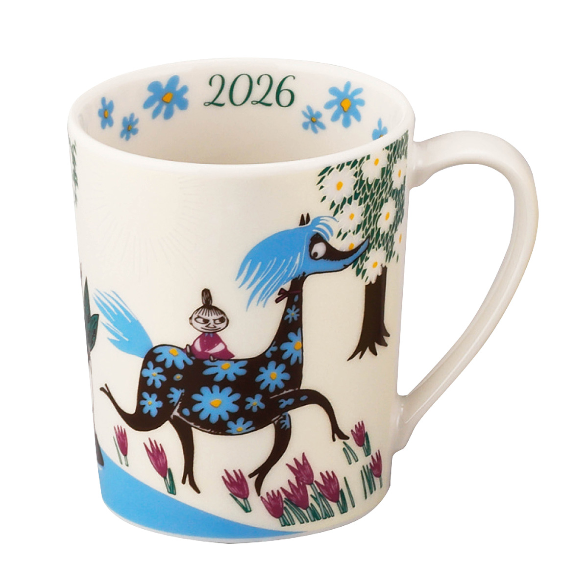 "2026年は午年。午年にちなんで、うみうまを主役にしたプレートとマグです。うみうまは、ムーミン谷の生き物で、花模様をまとった馬のような姿をしています。小説『ムーミンパパ海へいく』で、灯台の島でムーミントロールが出会った二頭が、浜辺を駆け回り、海に消える様子から「うみうま」と呼ばれるようになりました。プレートのリムや、マグの内側には、可愛らしいうみうまの花模様をあしらい空の色は、角度を変えるとキラキラ光って見える、偏光雲母を施しています。